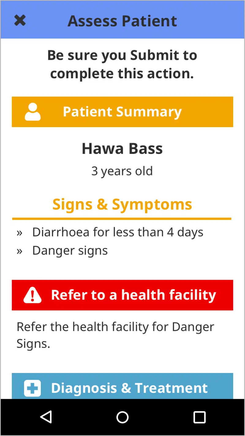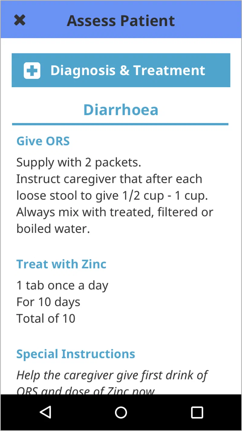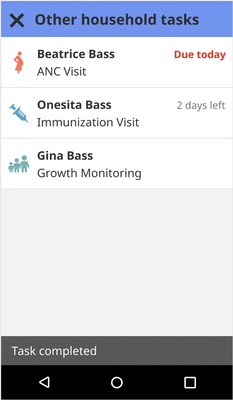 CHWs are able to complete tasks directly from this page, or exit by tapping on the โXโ. If the household has no additional tasks, they will return directly to the main task list.