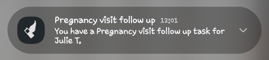 Tasks help CHWs plan their day by prompting them to complete follow-up visits and other activities. The list might include upcoming scheduled ANC or Immunization visits, treatment or referral follow-ups, or other required activities such as a household survey.