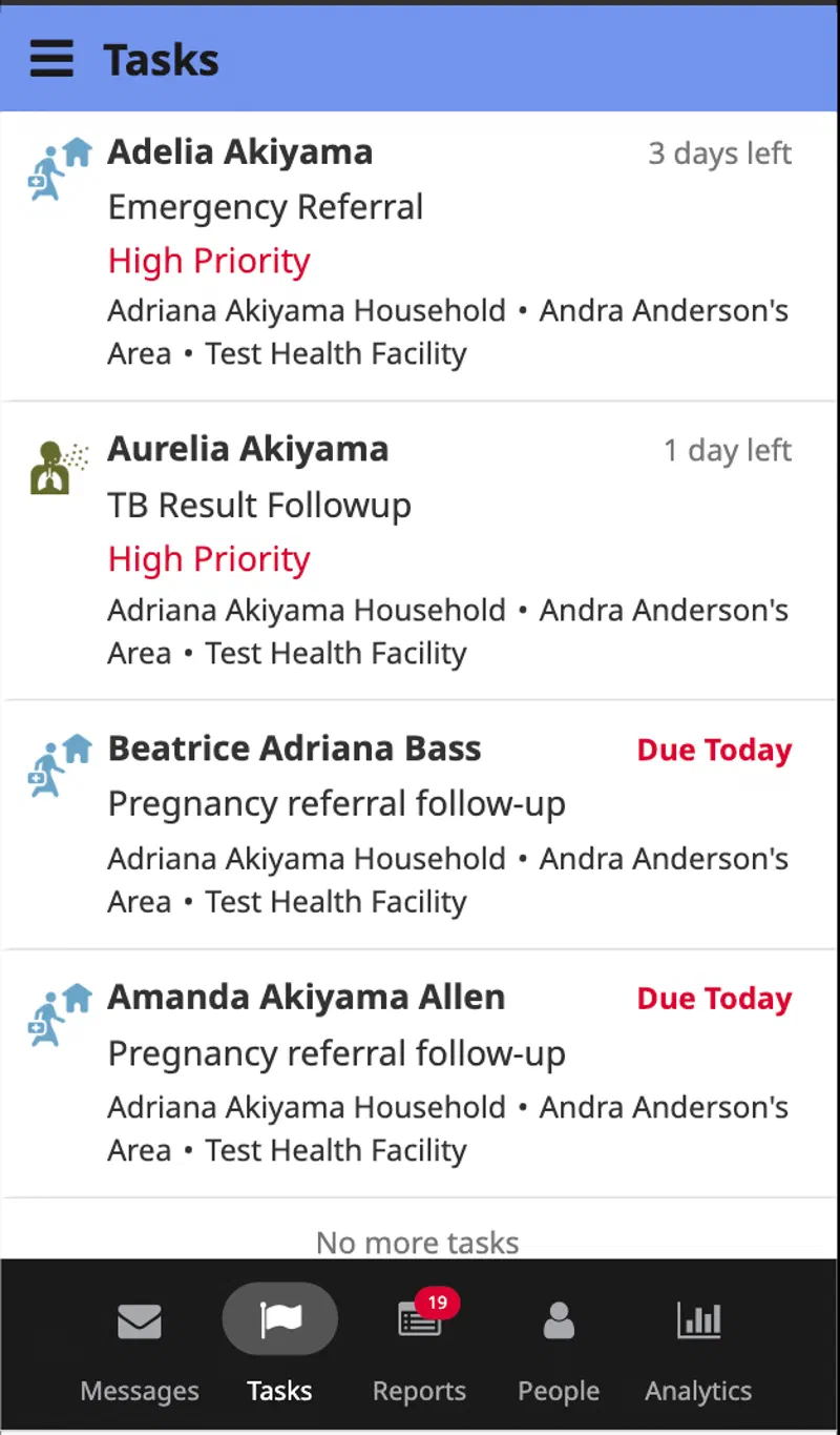 Tasks are listed in order of due date. Tasks that are past due will appear at the top of the list. CHWs should strive to complete tasks before they are overdue. Many programs add targets to track task completion and timeliness.