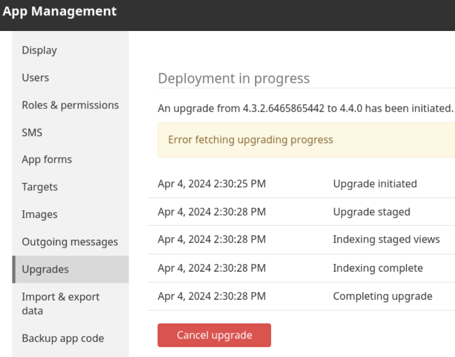 CHT Core admin UI showing the error Error fetching upgrade progress
